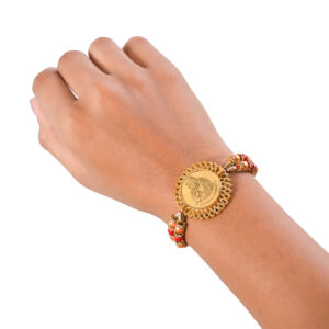 यह एक आकर्षक और शुभ राखी है, जिसमें गोल्डन प्लेटेड डिज़ाइन है। राखी पर भगवान गणेश जी और माता लक्ष्मी जी की आकृति मौजूद हैं। गणेश जी बुद्धि और विघ्नहर्ता के देवता हैं, जबकि लक्ष्मी जी धन और समृद्धि की देवी हैं। रक्षा बंधन के पवित्र अवसर पर भाई की कलाई पर बांधने के लिए बनाई गई, यह राखी सुरक्षा, समृद्धि और सफलता का आशीर्वाद देती है।
